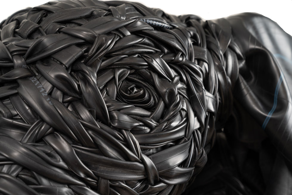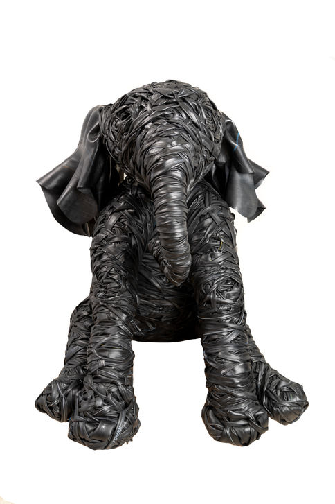 Tired is made of thousands of reclaimed bicycle innertubes and a metal pipe armature. It is the second large innertube elephant I've made. It's construction was motivated by loss and grief after a death.